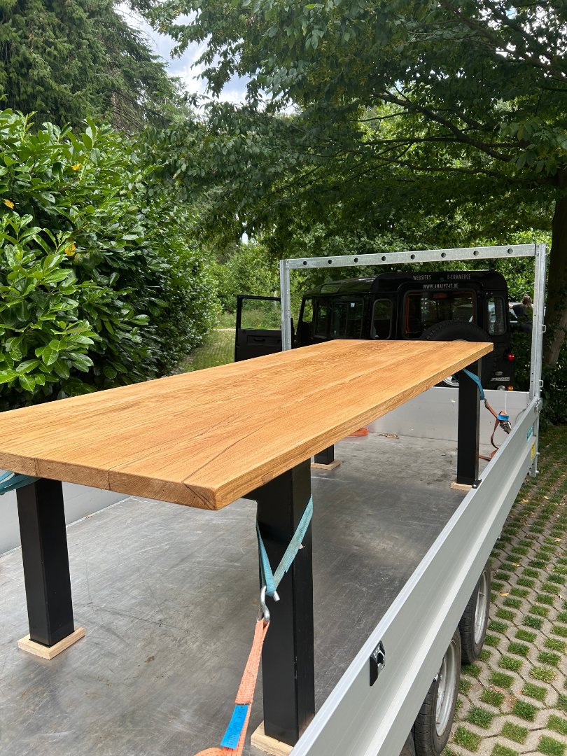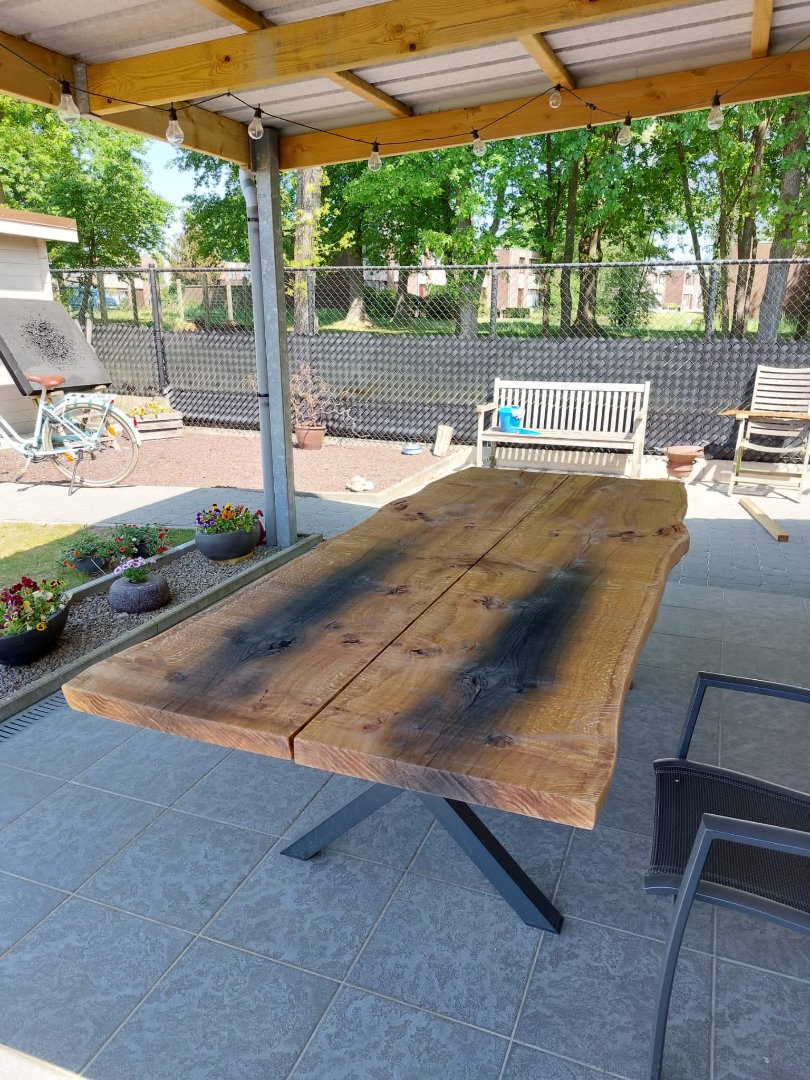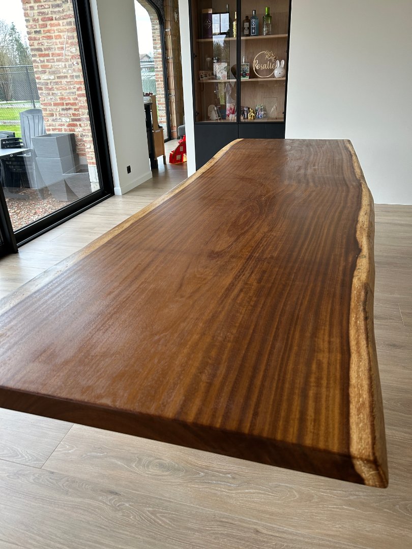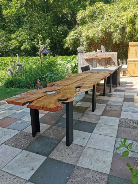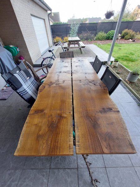 Bossmann zaagt boomstamplanken van jouw bomen. Er zijn ook gezaagde planken in voorraad. Hiernaast kan je enkele voorbeelden zien van boomstamtafels gemaakt uit gezaagde planken.